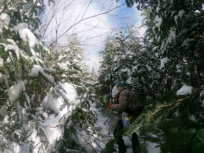 Did this hike with the Northeast Kingdom Section of the Green Mountain Club. Cathi Brooks led the hike, with a total of 5 attending. The trail is an out and back, a total distance of 3.4 miles, with 174 feet of elevation gain, a relatively flat hike. Much of the trail is not maintained. The snow was deep, but people had been through before us, except for the last half mile. There was orange ribbons that marked the trail when it got difficult to follow.